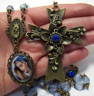 I handcrafted this beautiful 5 decade rosary one bead at a time, It has a large ornate cross. It was made using antique brass metals so it has a beautiful vintage appearance. The beads are high quality Preciosa brand 8mm faceted Czech Glass Beads in Frosted Blue a/b. The Beads are all accented with bead caps. The Our Father Prayer Beads are my own handmade Genuine Vintage style crystal settings in Dark Blue. The cross is an ornate over-sized cross measuring approx. 2 1/3 x 3 Inches and has the same crystal center that the our father prayer beads are made of. I used the picture of Mary pendant with the back reading *Immaculate Heart Of Mary Pray For Us* and a Picture of Mary suspended from that as the rosaries center, so there are actually 2 centerpieces making this longer then usual. When laying flat and straight the rosary measures approx. 30 Inches long tip to tip. I hand make each rosary myself with lots of love and close attention to detail. This is a link to my rosaries. http://stores.ebay.com/Heather-Rose-Jewelry-Boutique/Rosary-/_i.html?_fsub=5806767015